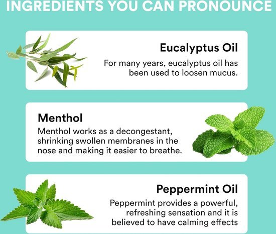 MENTHOL: is afgeleid van pepermunt, eucalyptus en pennyroyal. Wanneer het lokaal wordt aangebracht of oraal / nasaal wordt ingenomen, is aangetoond dat het helpt bij het behandelen van maagdarmproblemen, pijn, ontsteking en congestie.